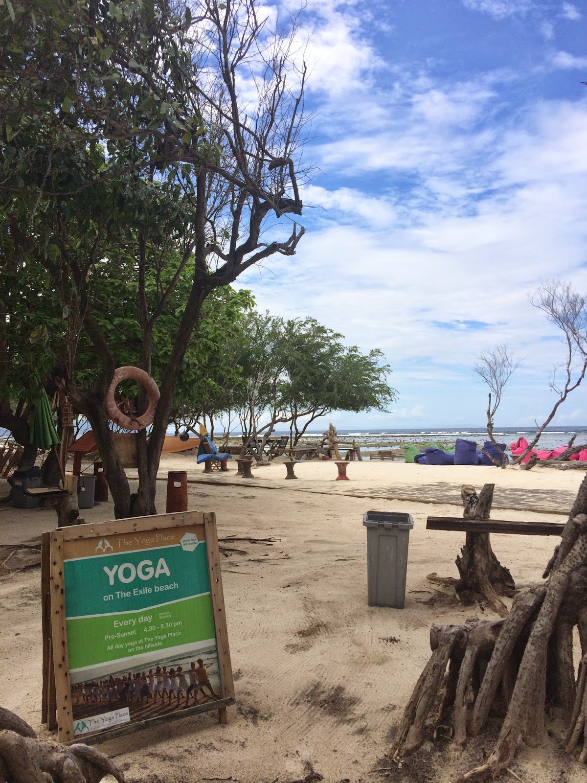 Emang sih, ketika lo lagi enjoy banget sama suatu moment, pasti cepet banget deh rasanya. Tau-tau udah 3 jam aja nangkring di Egoiste. Jam 4 Tara dan Ikhsan udah musti cabut buat nyebrang ke Lombok. Sementara saya rencananya mau Yoga by the beach jam 5 nanti. Untungnya kemarin sempet foto tulisannya, karena ternyata pas saya liat lagi buat mastiin, yoga sessionnya mulai jam 16.30. Sedangkan waktu itu udah jam 16.20. Kyaaaaa…saya buru-buru balik ke hostel, ganti kostum, trus pontang-panting nyari sewa sepeda, ngepot-ngepot deh ke Exile.