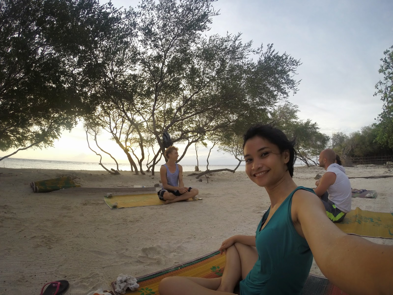 Perkenalan sebentar sama Michael, yang ternyata baru 6 bulan di Gili dan baru buka Yoga class gitu, namanya YogaPlace. Aslinya sih tempat yoga-nya ada di dalem village, di perbukitan. Salah satu sesi-nya buka di pantai kayak sekarang ini. Begitu mau mulai, tiba-tiba dateng sepasang muda mudi yang juga mau ikut yoga. Namanya Igor dan lupa! hahaha yang jelas mereka dari Russia. Kayaknya sih lagi kasmaran banget nih pasangan, soalnya lakik-nya meluk cewek-nya terus gak lepas-lepas mana ada adegan kissing-nya segala. Alamak! Saya aja yang ngeliat sampe awkward. Hahaha..