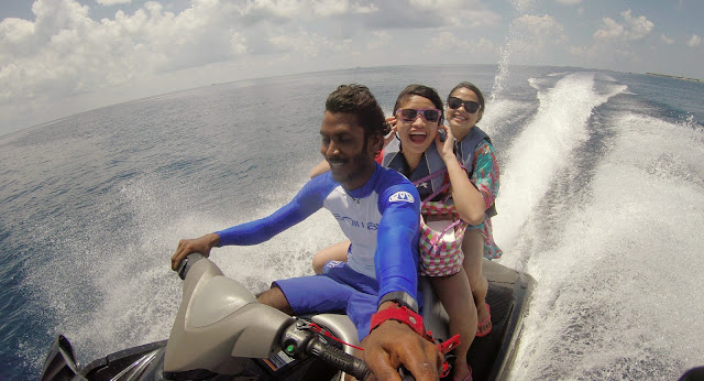 Selesai dive ke-2 sekitar jam 12.30, kirain kita bakal langsung dipulangin ke Maafushi, dan nanti baru akan ada orang hotel yang jemput kita buat nyusulin yang lain di Sand Bank. Eh taunya Jinah bilang kalau nanti kita akan dijemput sama Jetski buat langsung menuju Sand Bank. Eh bener aja, gak lama ada orang hotel nyamperin pake Jetski ke kapal diving kita di tengah-tengah laut!! Jadilah saya dan Aya tarik tiga sama abangnya macem cabe-cabean! Mana sepanjang perjalanan pake teriak-teriak norak segala pulak sangking senengnya!!