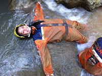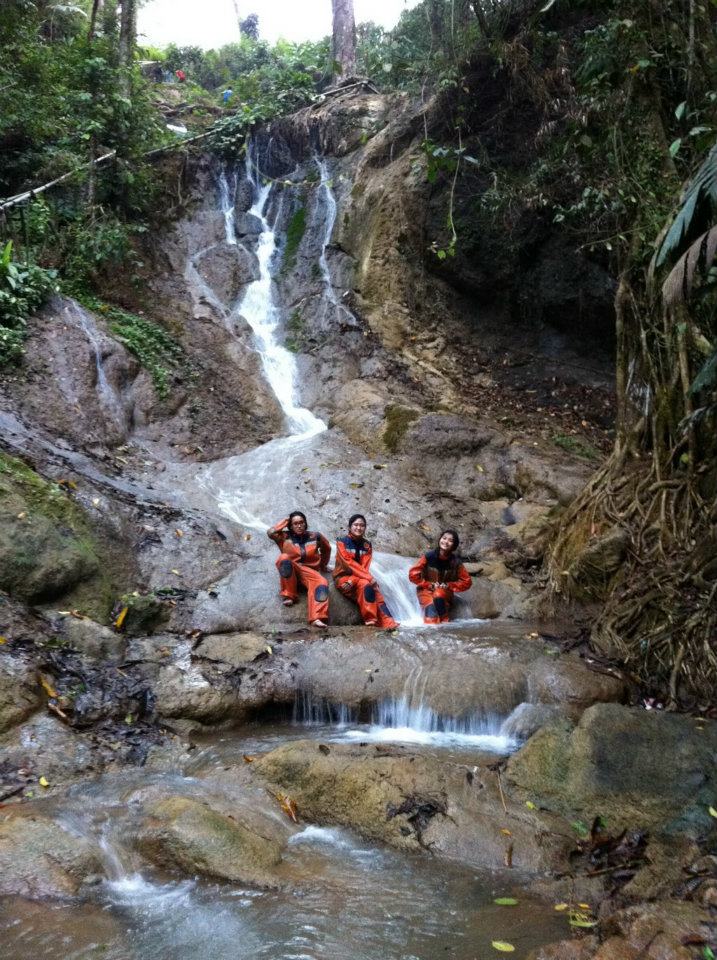 Pas jam setengah 1, dengan perlengkapan komplit (sepatu boot, helm, dan caving wearpack) pasukan sudah siap menuju mulut goa vertikal. Karena wearpack-nya warna oranye dan kita juga pake sepatu boot, tinggal bawa sapu udah deh persis dinas kebersihan DKI. Siap diangkut ke jalan-jalan protokol Jakarta. Hahaha…