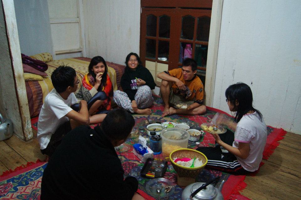 Rumah penduduk yang akan kita tinggali waktu itu terbuat dari kayu, sangat sederhana, bersih dan nyaman. Rumah ini milik Umi, ibu-ibu yang sekaligus jadi juru masak kita selama di Buniayu. Masakannya jangan ditanya, enak banget!! Kalo kata Pak Ferry, bumbu yang dipakai si Umi ini bumbu ikhlas. Makannya rata-rata tamu yang datang pasti kepincut sama masakan Umi. Sebelum masuk Goa jam setengah 1 nanti, kita disuguhi dulu makan siang buatan Umi dengan menu nasi sebakul + sayur sop hangat + bergedel kentang + kerupuk. Enak banget dimakan sambil menikmati udara dingin Sukabumi.